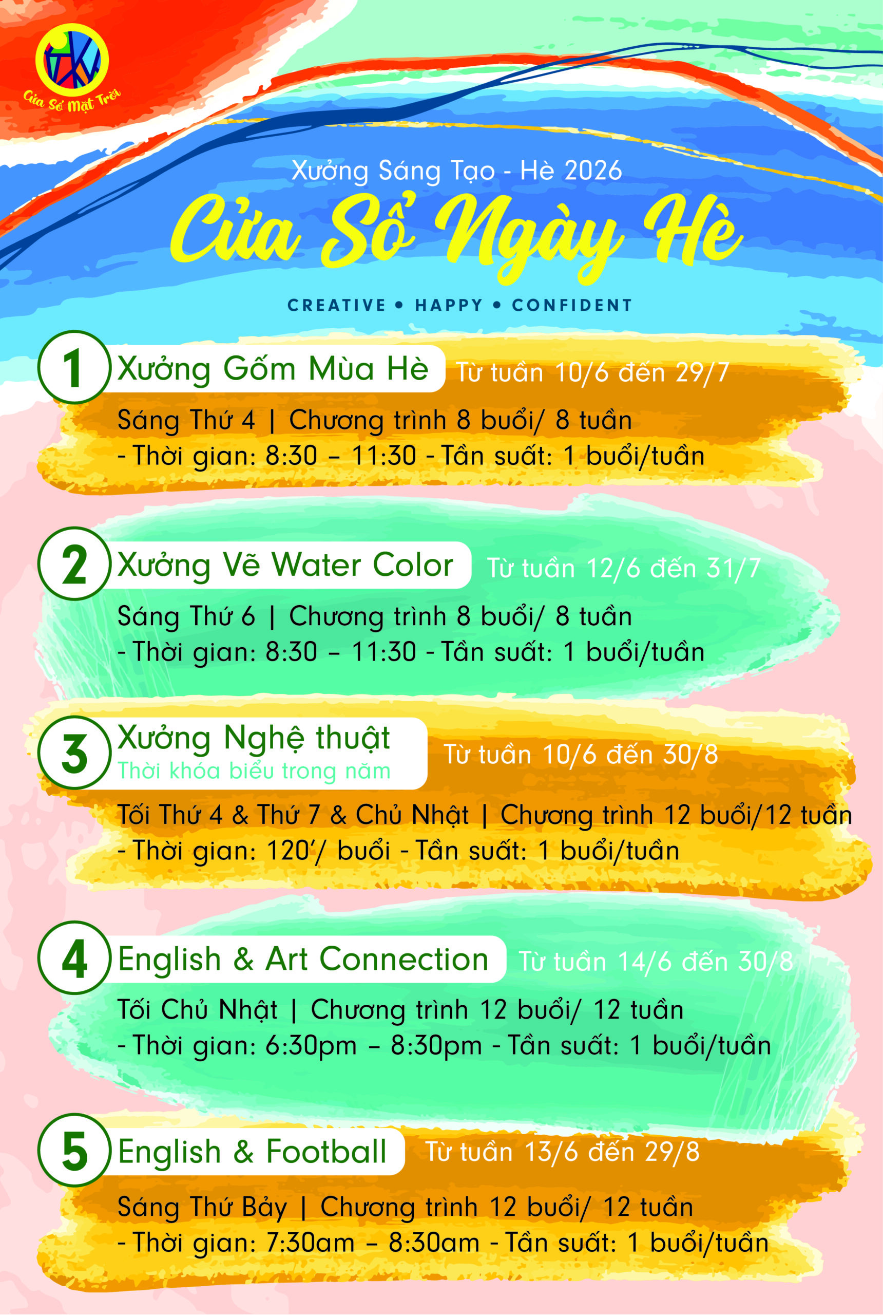 Mục tiêu giảng dạy của Cửa Sổ Mặt Trời: Tạo môi trường tự do, cho trẻ em được tương tác “thử và sai” để tự cảm nghiệm niềm đam mê nghệ thuật theo cách riêng của mình thông qua cọ màu và mĩ thuật ứng dụng sáng tạo.